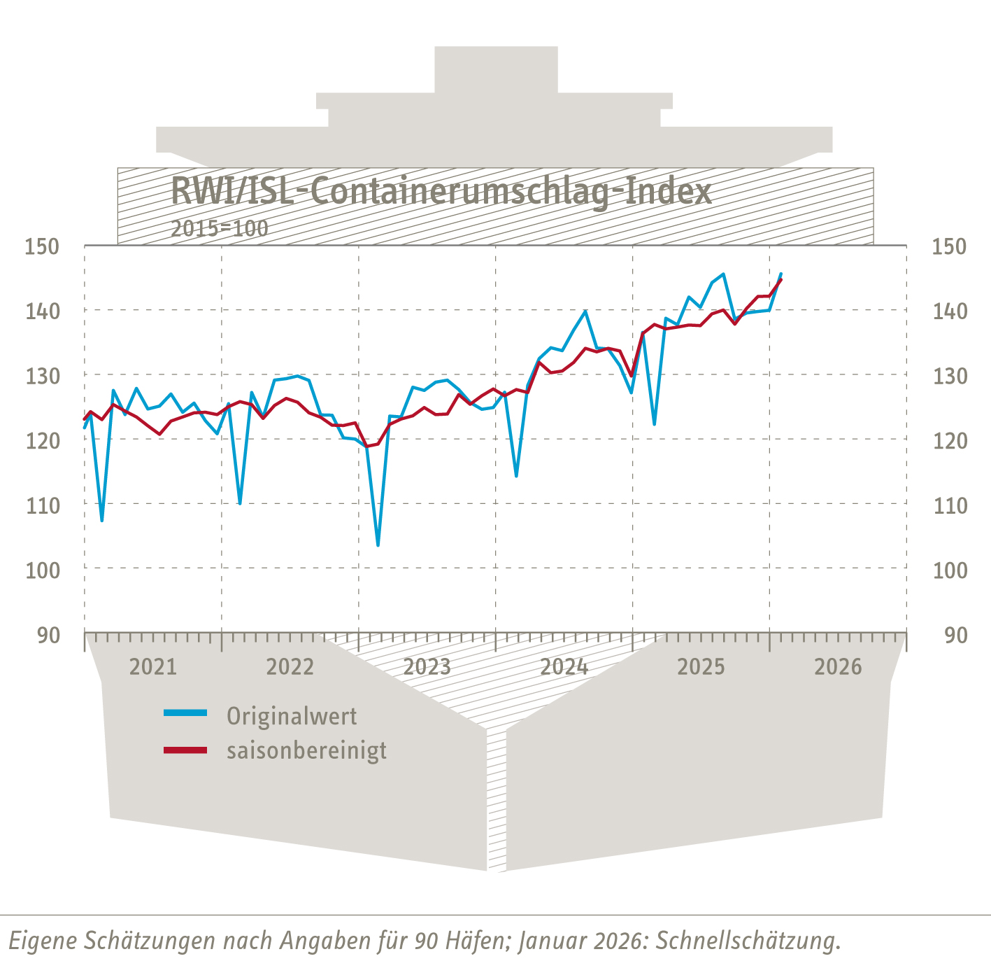 Der Containerumschlag-Index des RWI – Leibniz-Institut für Wirtschaftsforschung und des Instituts für Seeverkehrswirtschaft und Logistik (ISL) ist saisonbereinigt im Januar auf 144,7 Punkte gestiegen – gegenüber 142,1 Punkten (revidiert) im Vormonat.