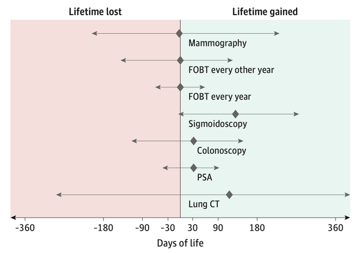 Dieses Ergebnis – dass Screening die Gesamtlebenserwartung nicht verlängert, sondern lediglich die krebsspezifische Mortalität senkt – ist nicht nur für Stuhlbluttest und Koloskopie dokumentiert, sondern auch für Mammographie, PSA-Test und Niedrigdosis-CT zur Lungenkrebsfrüherkennung (siehe Abbildung 1). Warum ist das so?