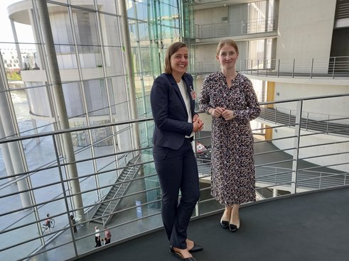 07. September 2023: Bei „Leibniz im Bundestag“ sprechen Wissenschaftlerinnen und Wissenschaftler des RWI mit Bundestagsabgeordneten über ihre Forschungsthemen. RWI-Wissenschaftlerin Kati Krähnert nutzt die Gelegenheit zum Austausch mit der SPD-Bundestagsabgeordneten Melanie Wegling. Thema ist “Zwei Jahre nach der Flutkatastrophe im Ahrtal: Pro und contra Pflichtversicherung für Elementarschäden”.