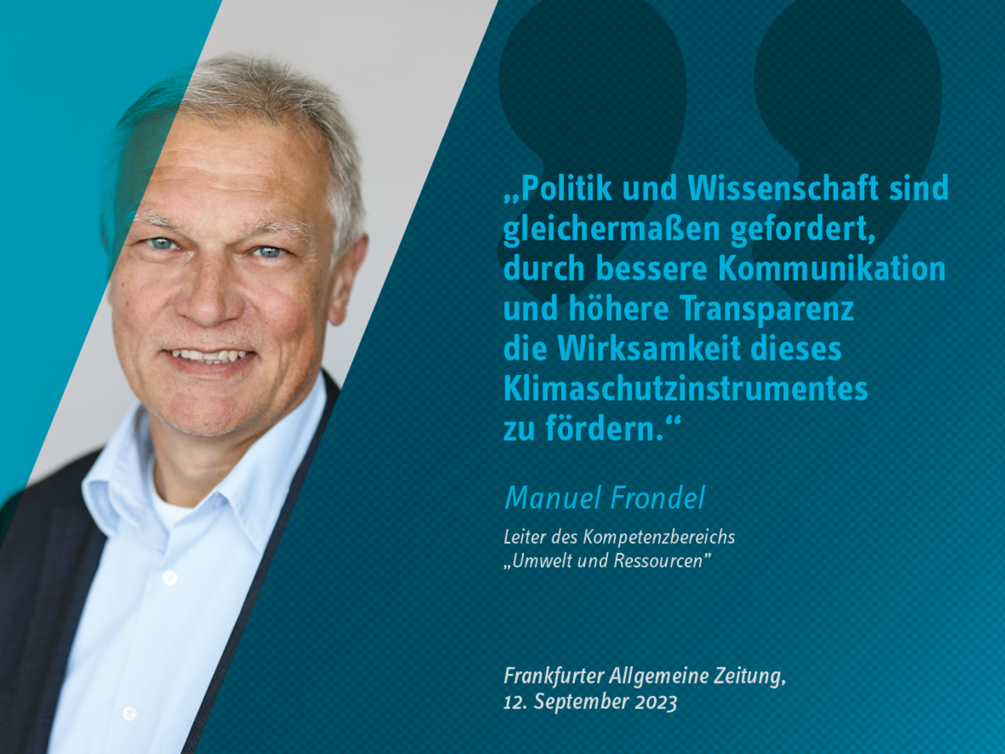 Im Fokus des Kompetenzbereichs „Umwelt und Ressourcen“ steht die Evaluierung von umwelt- und energiepolitischen Instrumenten und Maßnahmen mittels Methoden der Evaluationsforschung sowie mikroökonometrischer Analysen. Dies erfolgt entweder auf Basis externer Erhebungen oder eigens erhobener Daten, wie beispielsweise zum Energieverbrauch privater Haushalte. Die Arbeiten des Kompetenzbereichs gliedern sich in zwei Schwerpunkte: Der Schwerpunkt Umwelt-, Energie- und Ressourcenökonomik befasst sich unter anderem mit dem effizienten Einsatz von Ressourcen wie Wasser, metallischen Rohstoffen oder fossilen Brennstoffen. Im Schwerpunkt Umwelt- und Energiepolitik steht die Evaluierung von umwelt- und energiepolitischen Maßnahmen und Instrumenten im Mittelpunkt. Seit Anfang 2021 ist zudem die Forschungsgruppe „Prosoziales Verhalten“ Teil des Kompetenzbereichs.