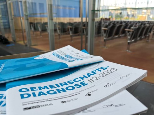 5. April 2023: Das Frühjahrsgutachten der "Gemeinschaftsdiagnose" der führenden Wirtschaftsforschungsinstitute erscheint. Die Beratungen dazu haben zuvor im Münchner ifo-Institut stattgefunden, wo ifo-Präsident Clemens Fuest die Projektgruppe herzlich begrüßt. Das Gutachten trägt den Titel „Inflation im Kern hoch – Angebotskräfte jetzt stärken“. Für 2023 und 2024 erwarten die Institute eine Zunahme des Bruttoinlandsprodukts um 0,3 bzw. 1,5 Prozent.