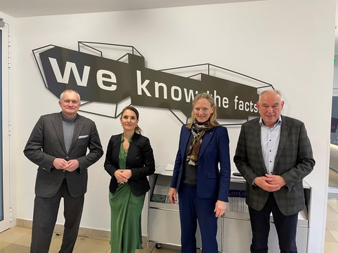 20. Januar 2023: Anlässlich der RWI-Verwaltungsratssitzung ist Gonca Türkeli-Dehnert, Staatssekretärin im Ministerium für Kultur und Wissenschaft des Landes Nordrhein-Westfalen erstmals zu Gast im RWI. Das Foto zeigt (v.l.n.r.): RWI-Präsident Christoph M. Schmidt, Staatssekretärin Gonca Türkeli-Dehnert, Birgitta Wolff (Vorsitzende des RWI-Verwaltungsrats) und Manfred Breuer (stellvertretender Vorsitzender des RWI-Verwaltungsrats und Präsident der Gesellschaft der Freunde und Förderer des RWI).