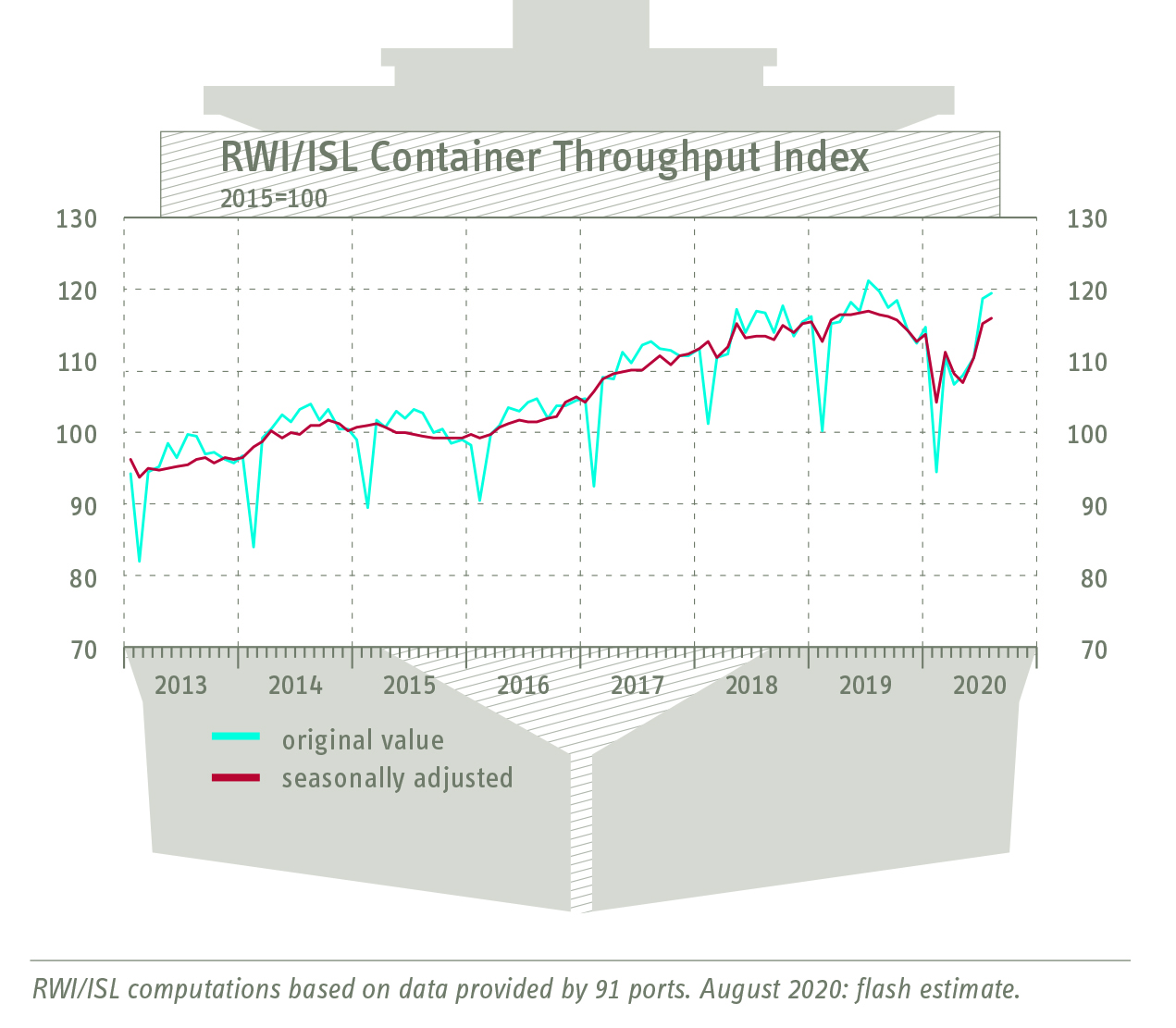 • The Container Handling Index of the RWI - Leibniz Institute of Economic Research and the Institute of Shipping Economics and Logistics (ISL) rose slightly in August, seasonally adjusted, from (revised) 115.2 to 116.1.