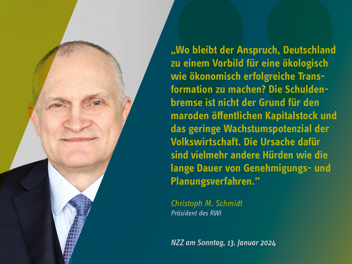 Das RWI wird weiterhin mit wissenschaftlicher Expertise und unabhängiger Analyse seinen Beitrag leisten, damit Deutschland die Herausforderungen meistern und seine Zukunftsfähigkeit sichern kann. Wir danken Ihnen für Ihr Vertrauen und Ihre Unterstützung im vergangenen Jahr und freuen uns auf den weiteren gemeinsamen Weg.