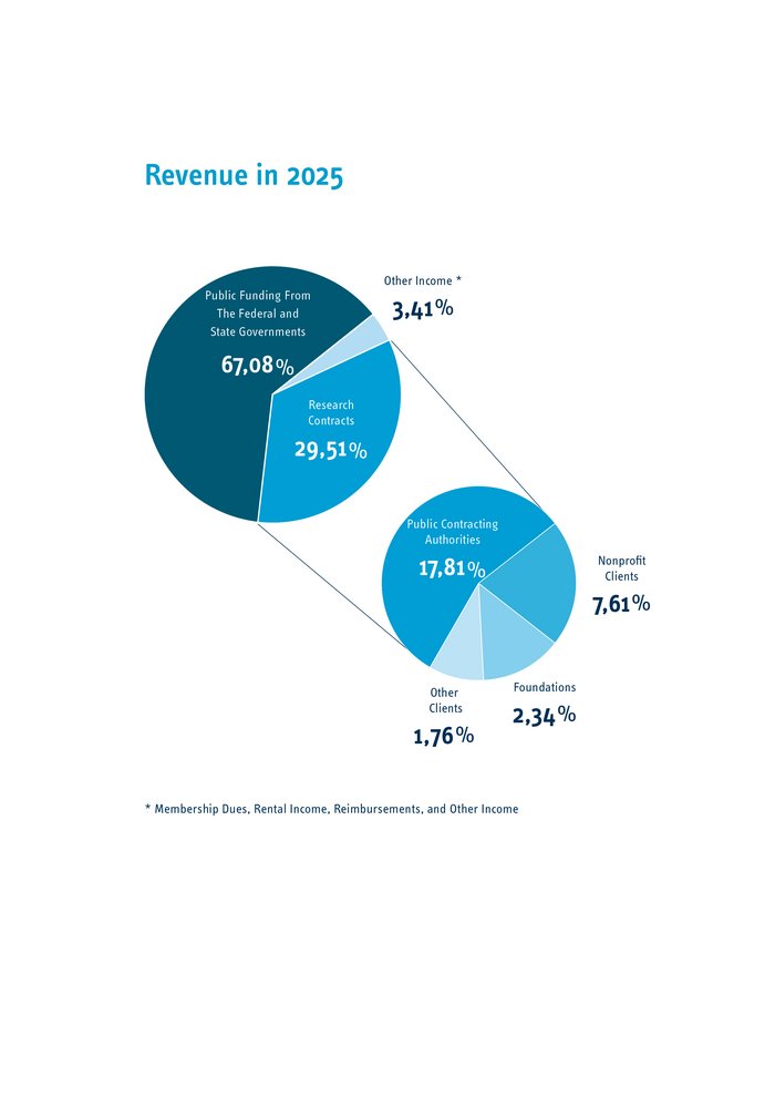 As a member of the Leibniz Association, RWI receives public grants from the federal government and the state of North Rhine-Westphalia. This grant accounts for just under two-thirds of the institute's total income. In addition, RWI receives funding through research contracts, which also mainly come from public clients such as the federal and state ministries.