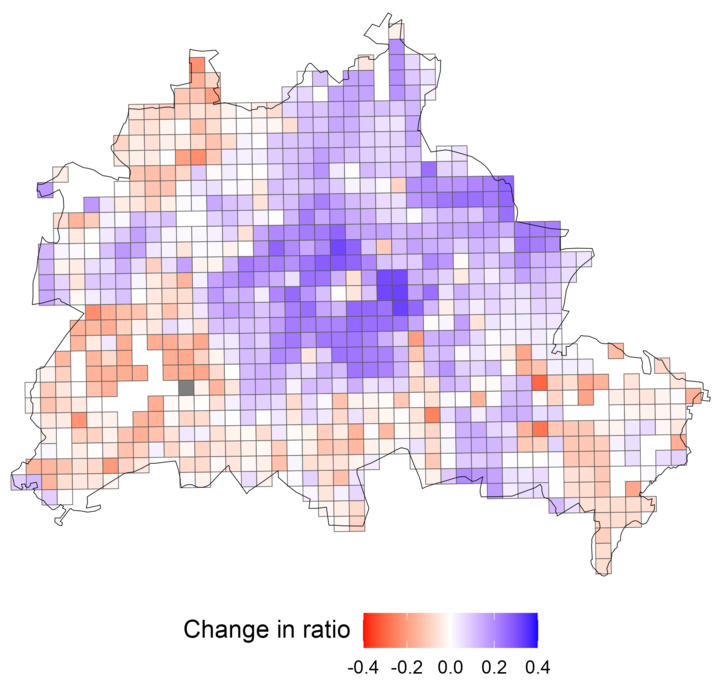 Bevölkerungsentwicklung (Feld A) und Veränderung des Verhältnisses zwischen alten und jungen Menschen (Feld B) zwischen 2020 und 2060 auf Netzebene für Berlin