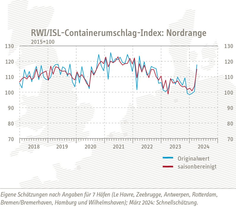 Zur Entwicklung des Containerumschlag-Index sagt RWI-Konjunkturchef Torsten Schmidt: „Der kräftige Anstieg des Containerumschlags in den europäischen Häfen dürfte zumindest teilweise darauf zurückzuführen sein, dass viele Containerschiffe die Durchfahrt durch das Rote Meer vermeiden und die Route um Afrika bevorzugen. Dadurch dürften einige Lieferungen nach Europa verzögert worden und nun in den Märzwerten enthalten sein. Dennoch spiegelt sich in dem Anstieg wohl auch die konjunkturelle Erholung im Euroraum wider, die nun etwas an Fahrt aufnehmen dürfte.“